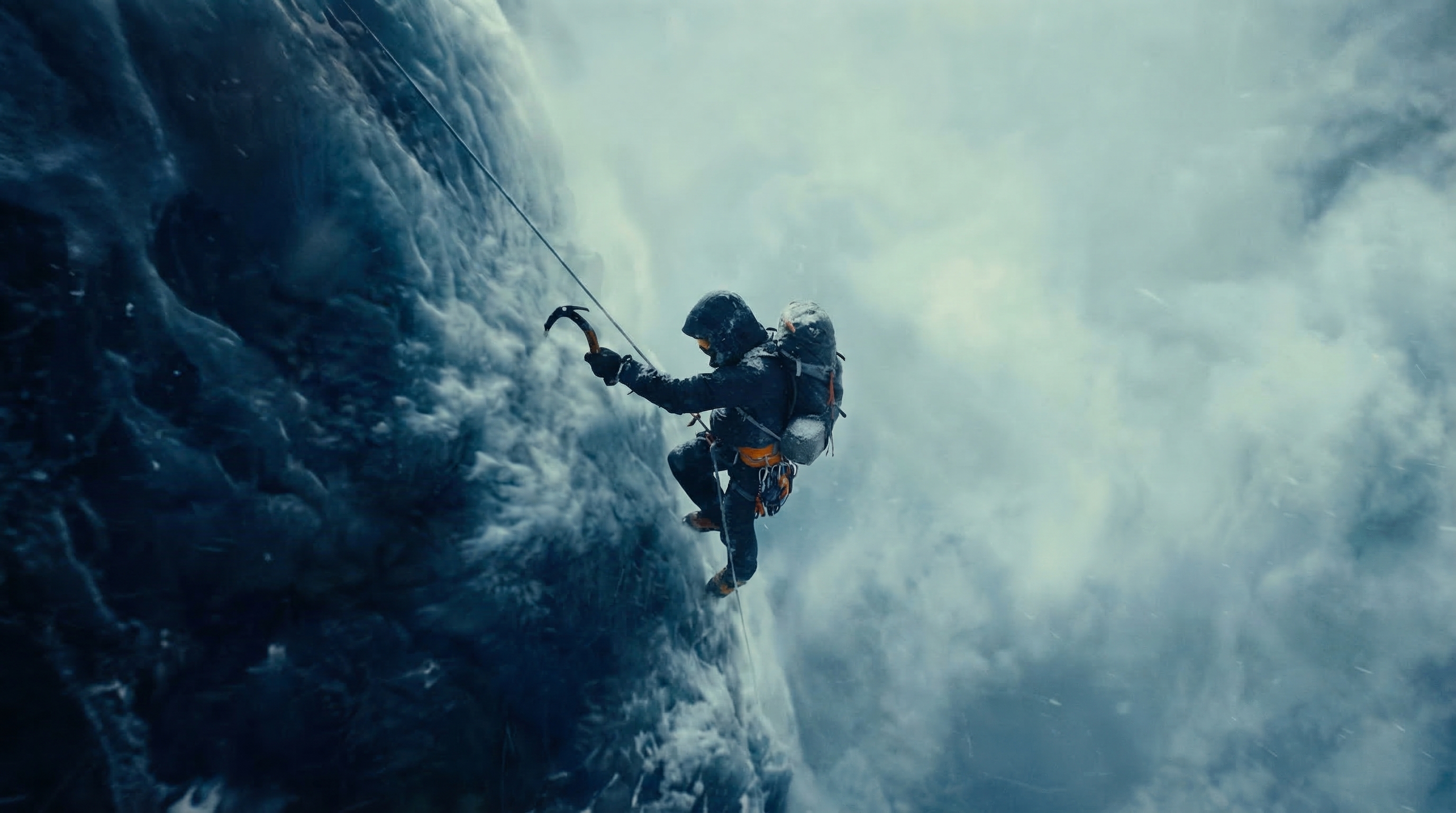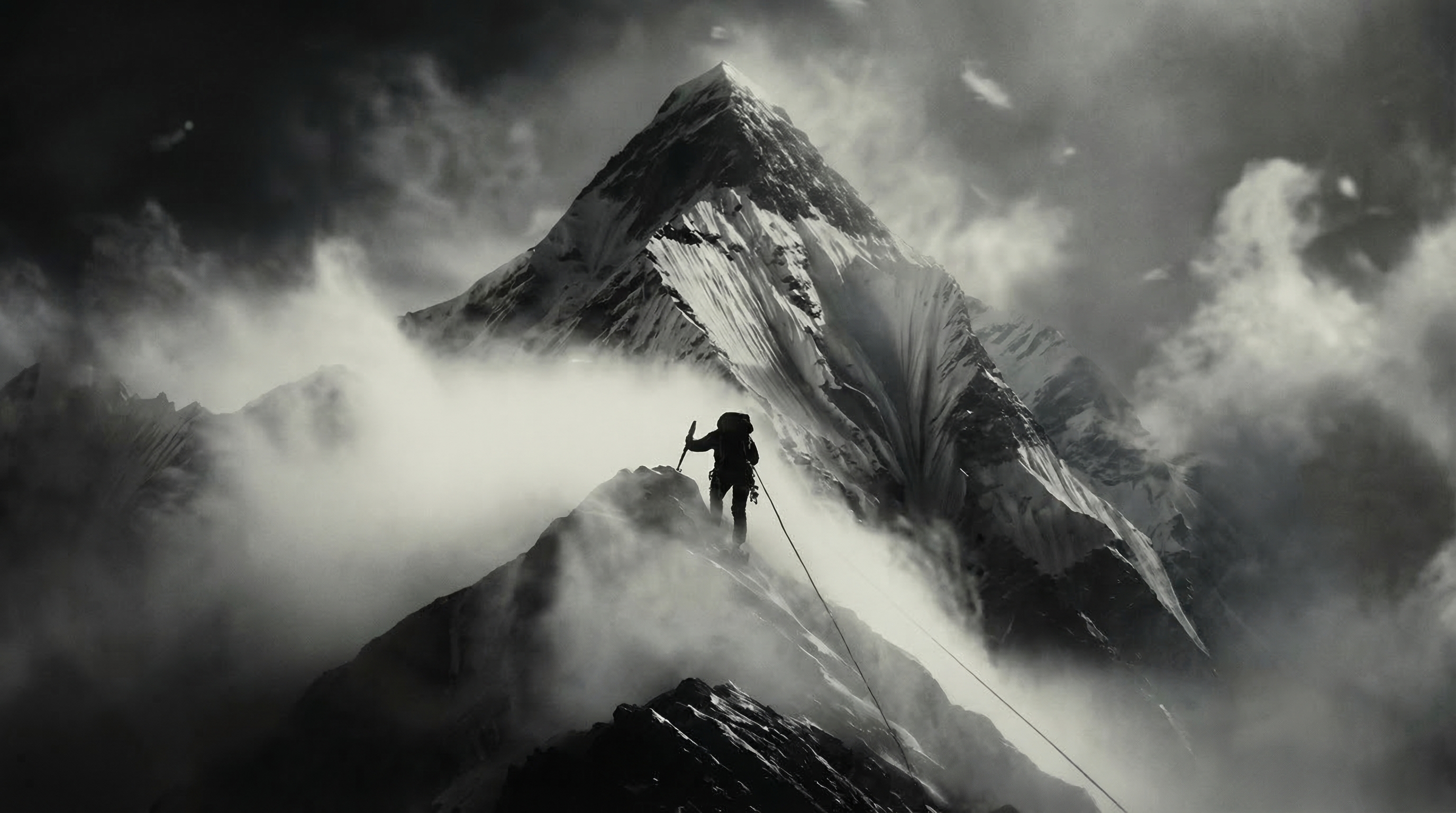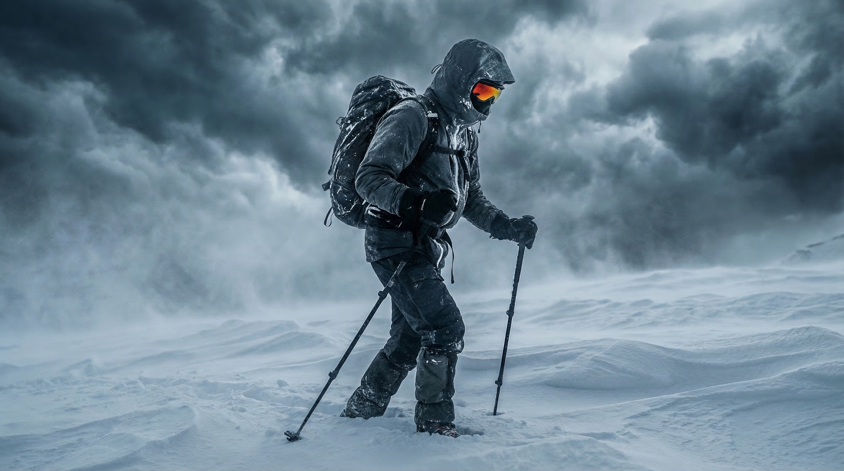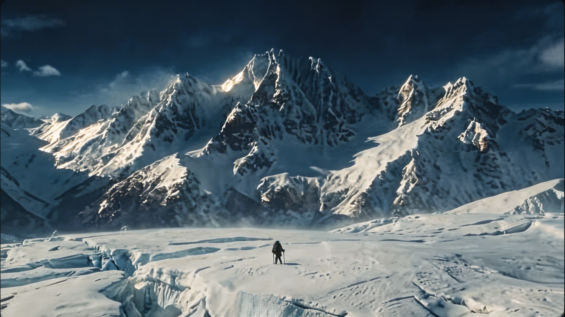 A lone mountaineer in a frozen landscape, dramatic storm clouds, cinematic 4K.|