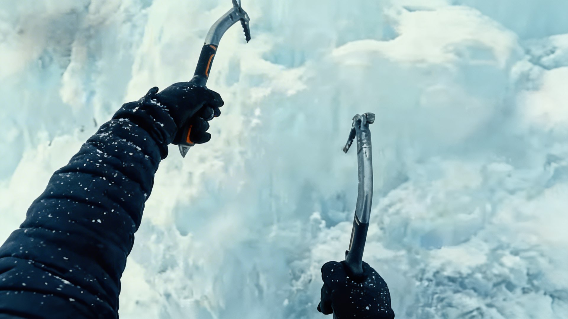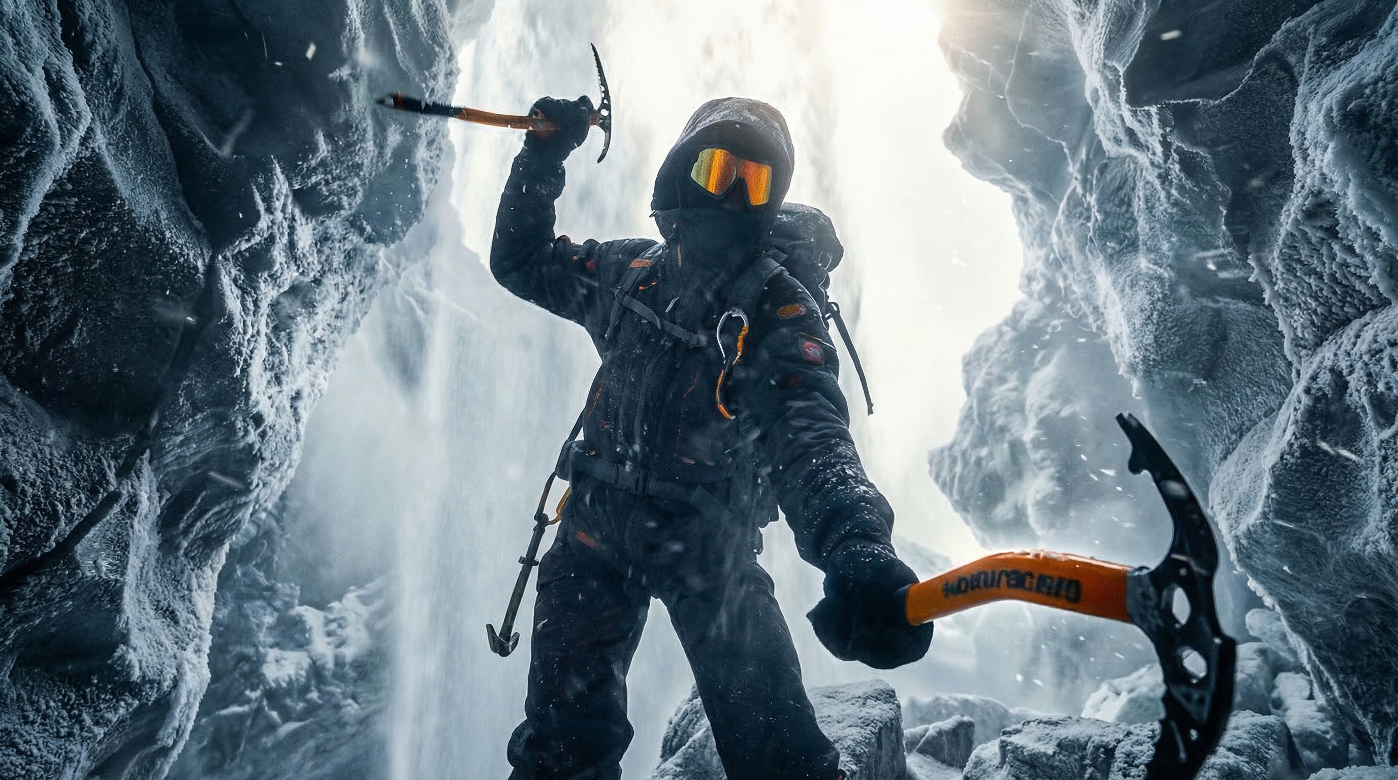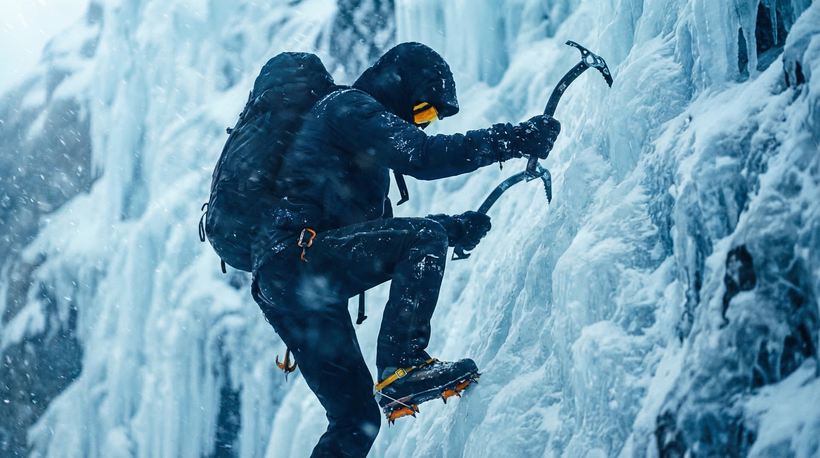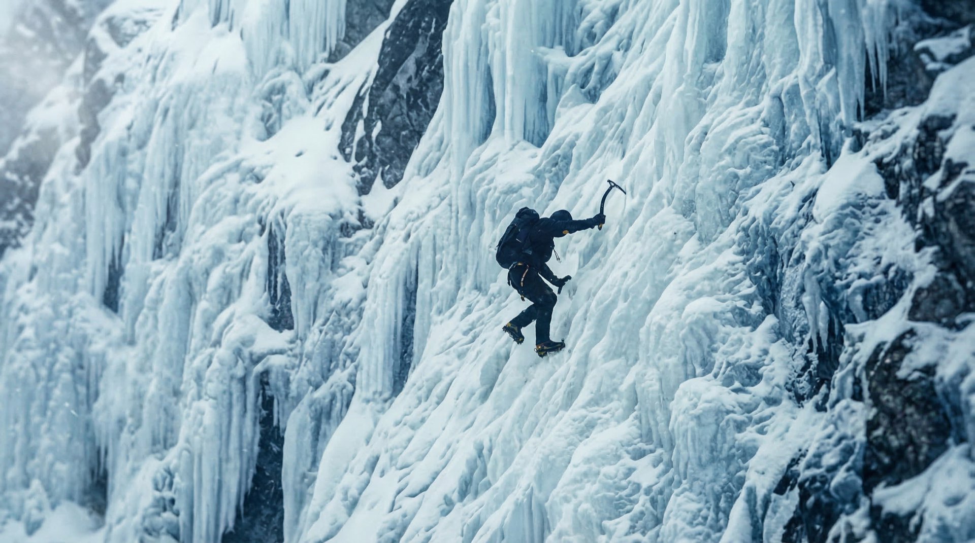 A lone mountaineer in a frozen landscape, dramatic storm clouds, cinematic 4K.|